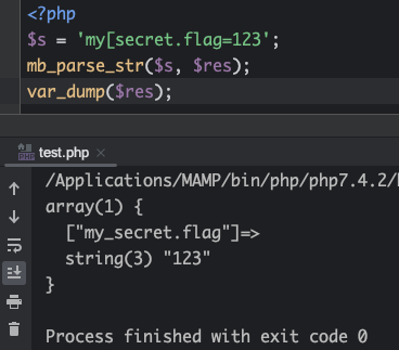 由于PHP的机制,直接传入参数my_secret.flag,其中.这种特殊字符会被转化为_。经过测试输入my[secret.flag只有第一个[会被转化,而之后的.会保留。