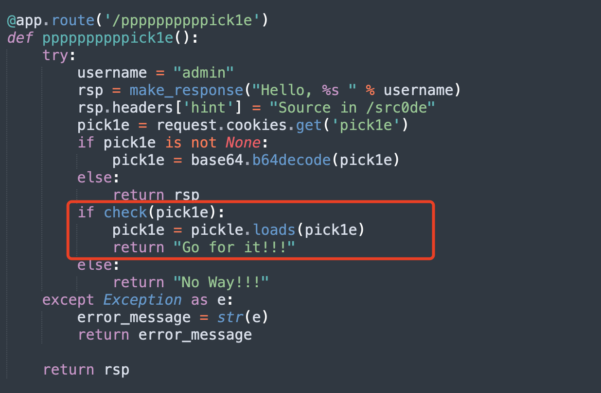 首先base64解码session得到secret key,session伪造admin访问的到路由/ppppppppppick1e。