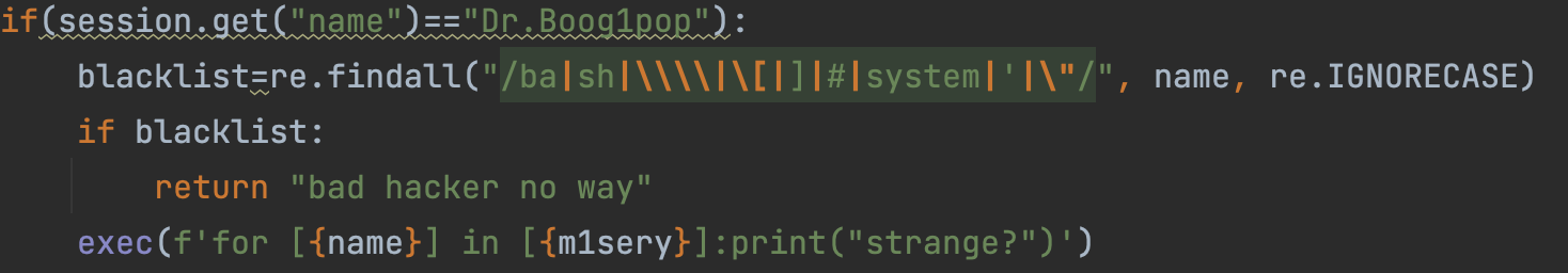 回到题目,在伪造了session['name']后,在exec处可以通过控制name变量来达到一种模版注入的效果。