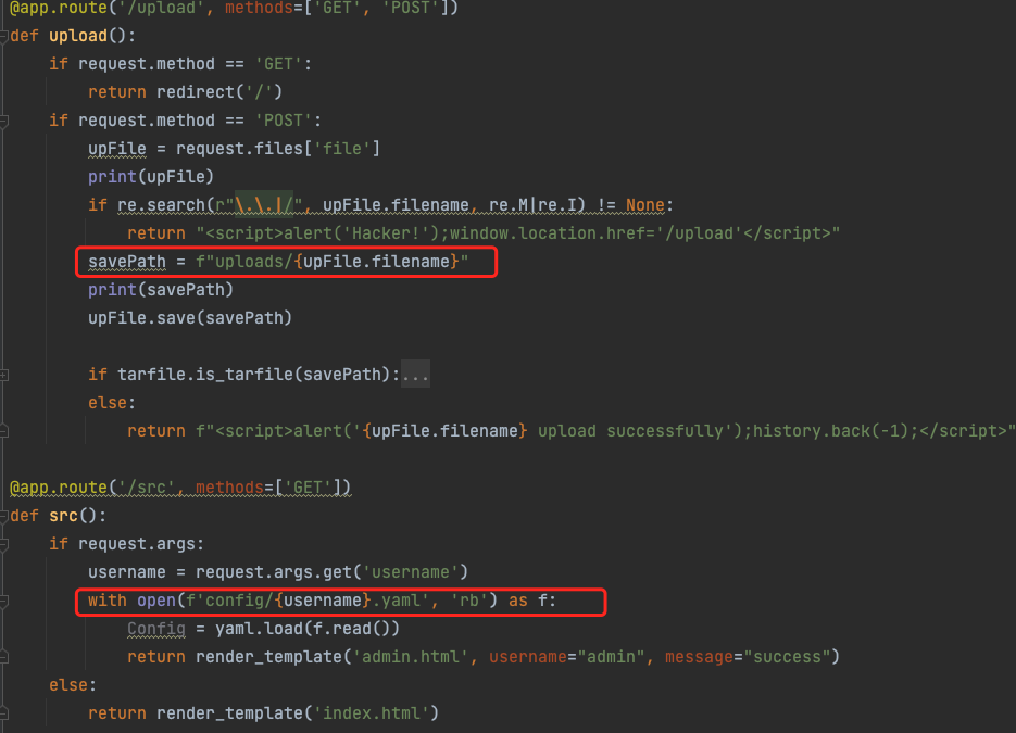 上传保存的文件路径为/uploads,反序列yaml的路径在/config下。而上传tar文件,会进行解压。使用tar目录穿越使文件解压时穿越/uploads到/config下