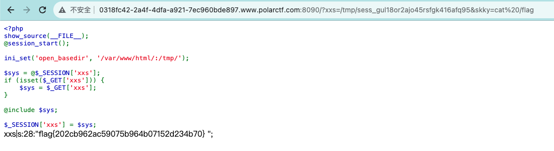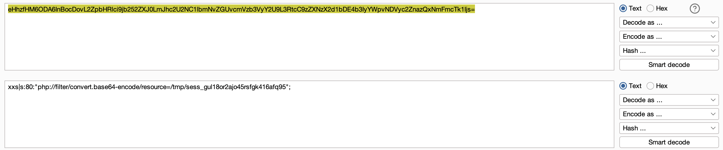 尝试用Cookie中的PHPSESSID=gul18or2ajo45rsfgk416afq95,结合php伪协议读session/?xss=php://filter/convert.base64-encode/resource=/tmp/sess_gul18or2ajo45rsfgk416afq95,发现可以读,同时确定了session文件保存位置。