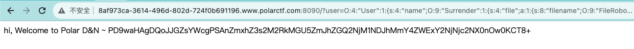 目的是执行到FileRobot的__invoke,分析代码之后,FileRobot的__get有个可变函数调用的形式。Surrender中的__toString令$this->file['filename']为一个FileRobot对象来触发FileRobot的__get,最后读出../flag.php(😅)。