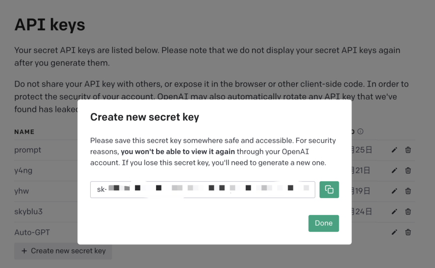 - 在https://platform.openai.com/account/api-keys页面创建新的 API Key