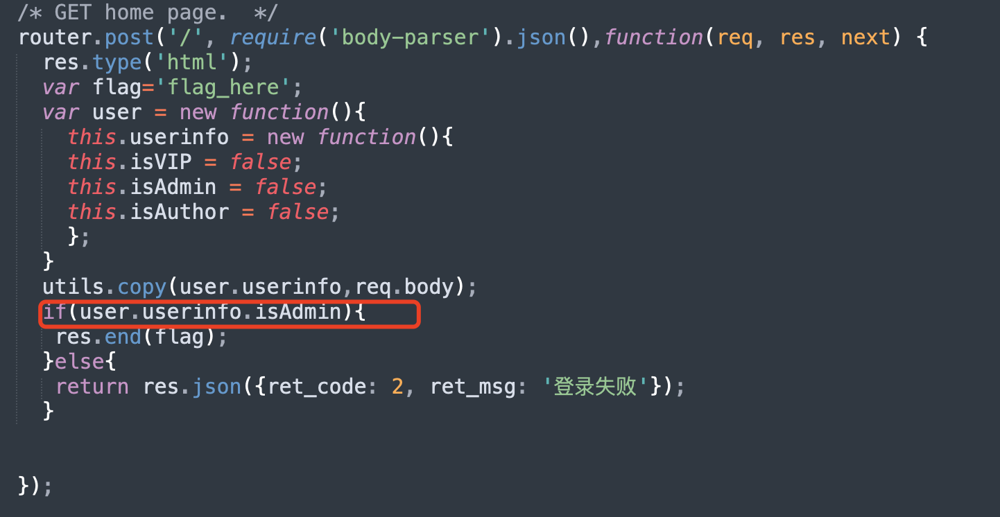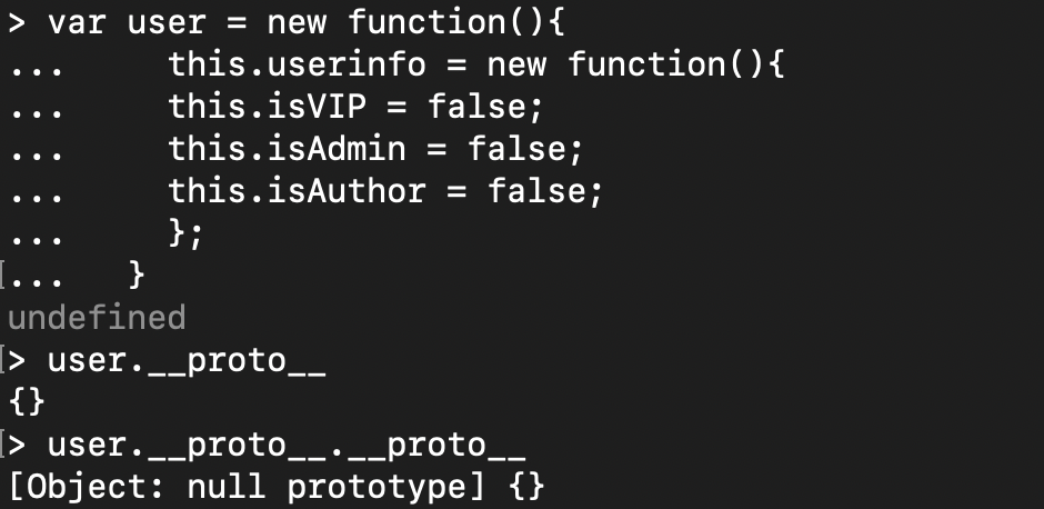 这里的isAdmin属性是无法覆盖的,所以利用点还是在api.js中的Function(query)(query)。因为copy的对象是user.userinfo它的原型(所继承的对象)是一个函数,所以要用两个__proto__才能指向Object.prototype。