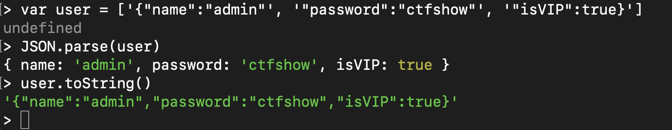 使用这种方式去绕过逗号,payload为/?query={"name":"admin"&query="password":"ctfshow"&query="isVIP":true},它会被解析为数组['{"name":"admin"', '"password":"ctfshow"', '"isVIP":true}']。这里我猜测,JSON.parse()在解析数组的时候,会调用数组对象的toString方法,而数组对象的toString方法会将里面的元素用逗号连接为一个字符串,所以会被正常解析为JSON。