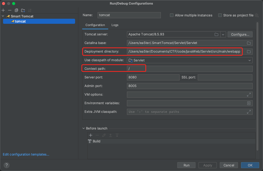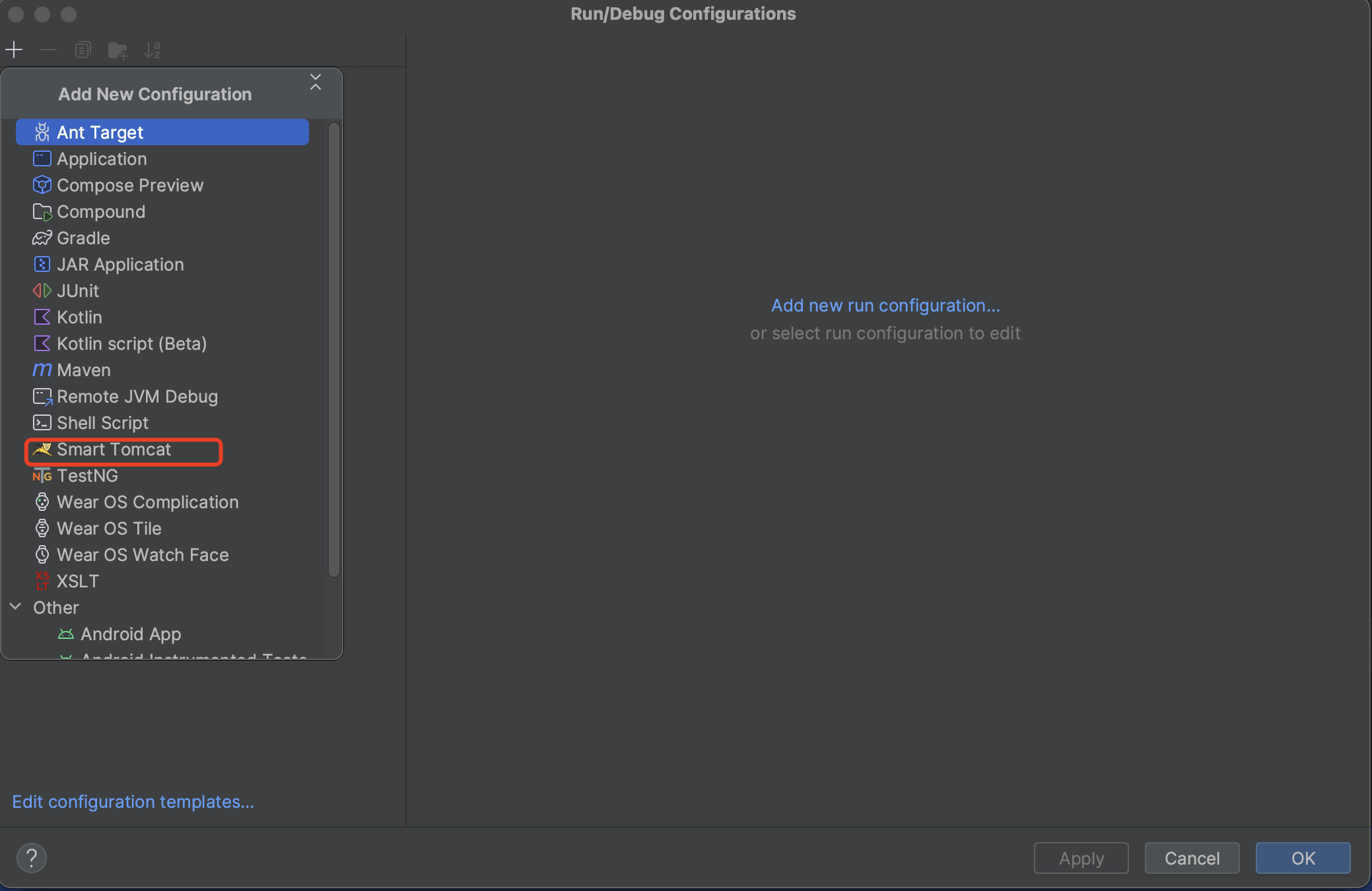 Run -> Edit Configuration 新建一个Smart Tomcat