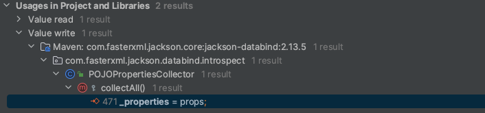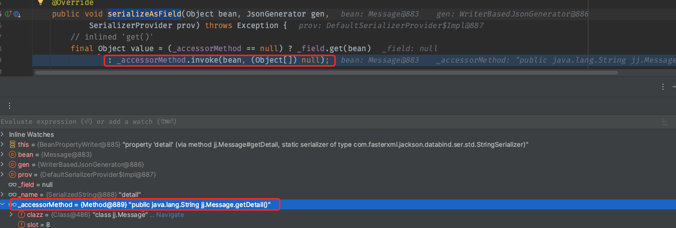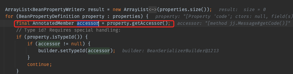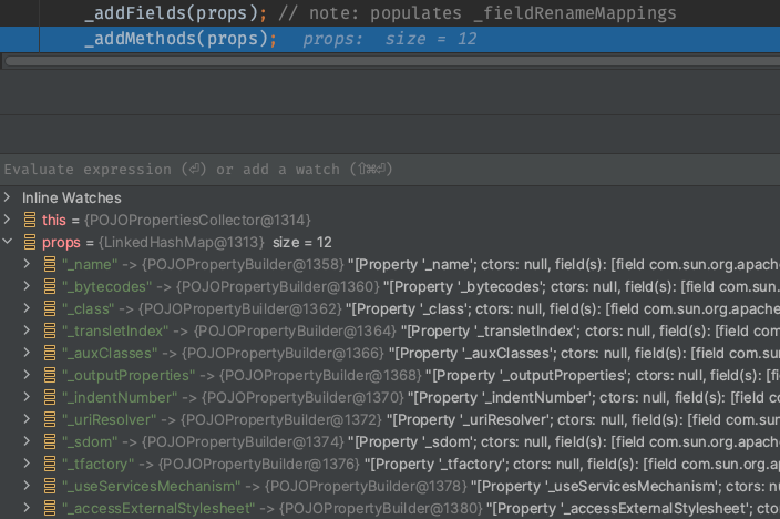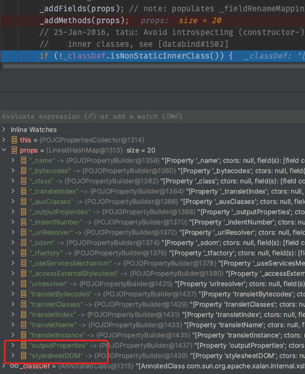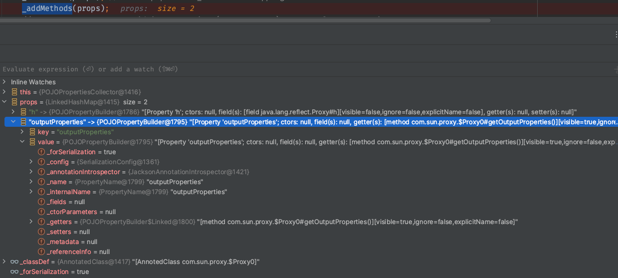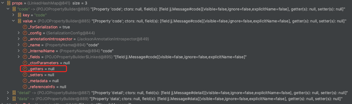 在赋值处下断点,分析函数中的props变量。props是一个POJOPropertyBuilder对象数组,POJOPropertyBuilder继承于BeanPropertyDefinition。从前面知道,之后会调用这个类的getAccessor方法来获取member,而这个getAccessor方法最终会返回POJOPropertyBuilder对象的_getters.value。