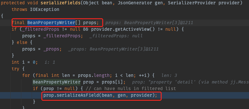 往上走一层,serializeAsField是在一个循环中被调用,循环的是BeanPropertyWriter对象的数组props