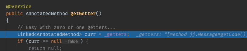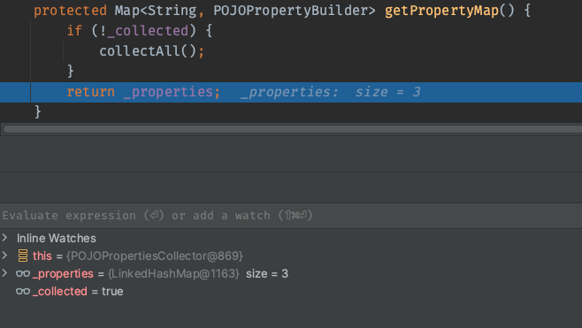 在这行下个断点,重新调试看看它的逻辑。在com.fasterxml.jackson.databind.introspect.POJOPropertiesCollector#getPropertyMap,由于_collected被设置为true,所以函数直接返回了_properties。