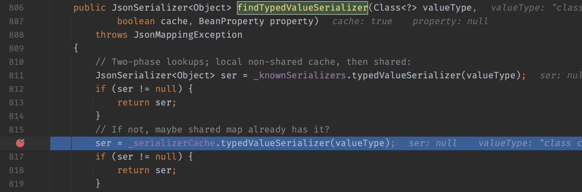 而com.fasterxml.jackson.databind.SerializerProvider#findTypedValueSerializer中获取序列化器有缓存机制,在第一次便会创建缓存。所以Payload一旦失败,之后便不再会成功。