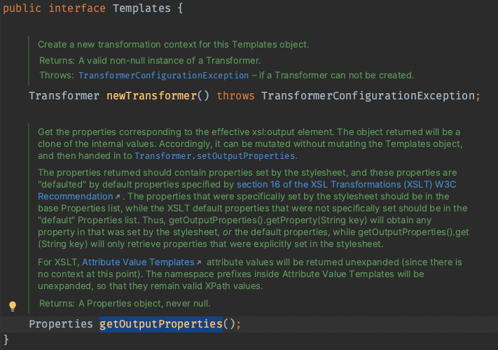 而TemplatesImpl的接口Templates只有两个方法newTransformer和我们要用的getOutputProperties