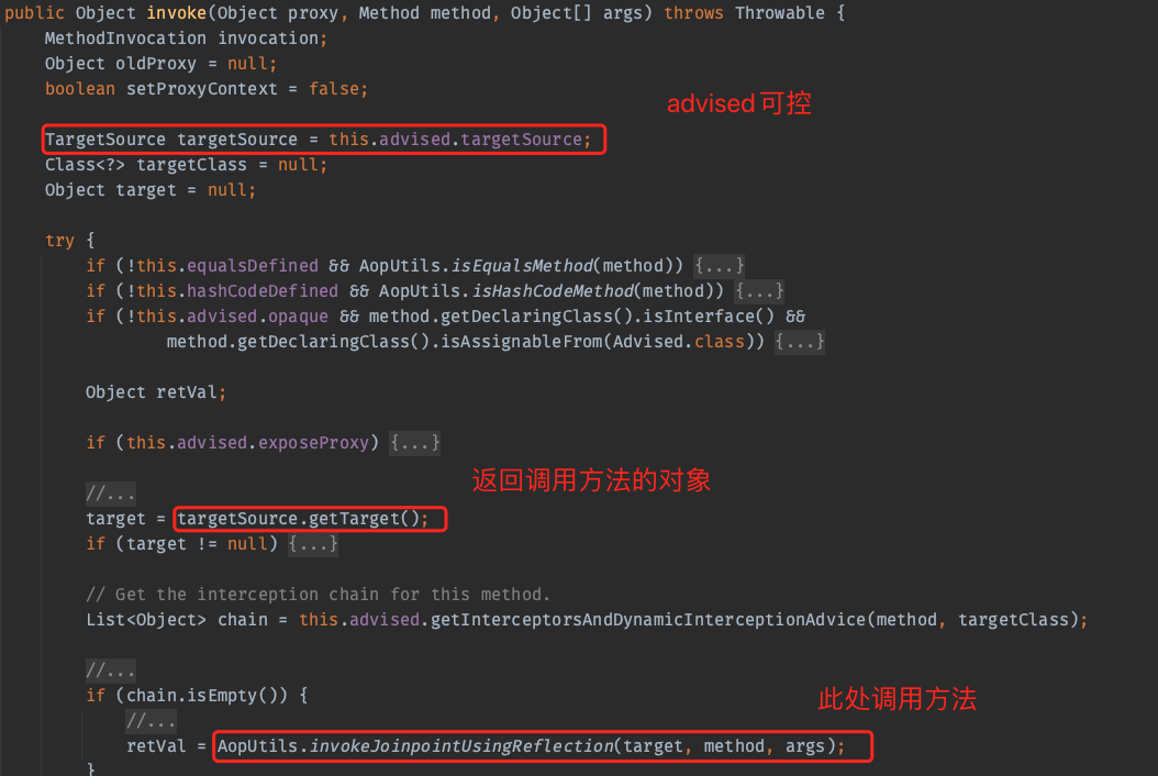 JdkDynamicAopProxy实现了 JDK 动态代理机制,用于创建代理对象来实现面向切面编程(AOP)的功能。在它的invoke中调用方法的部分如下