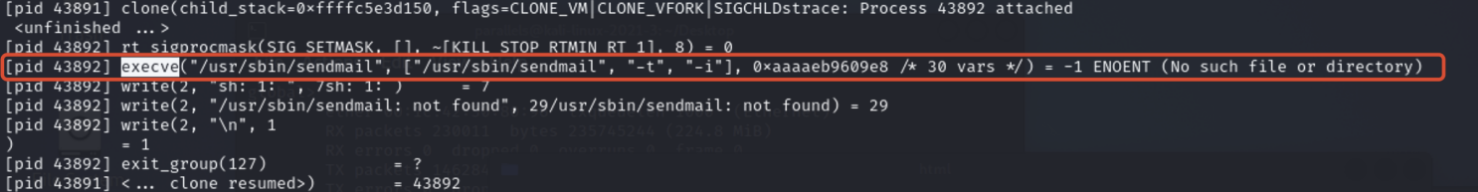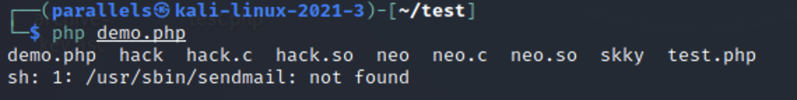 strace这个脚本strace php demo.php,发现程序会启子进程来调用sendmail,而sendmail又使用了geteuid函数。于是我们可以像刚刚那样劫持geteuid来执行命令。