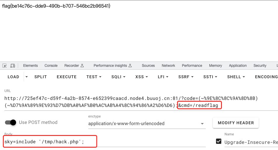 用sky参数执行代码包含/tmp/hack.php,在用cmd参数执行/readflag,命令的结果会被保存在/tmp/hackerfile,同时在页面中读取出来。