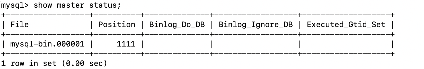 在主服务器上执行:show master status;,记录下File和Position(mysql-bin.000001, 1111)。