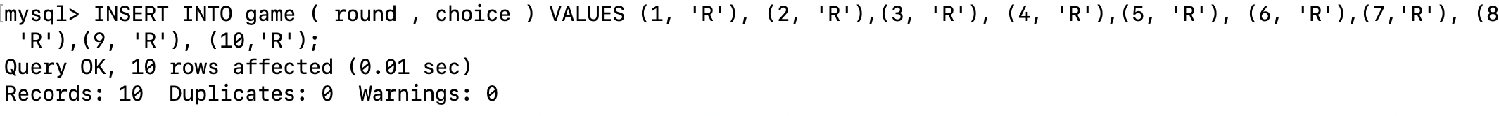 INSERT INTO game ( round , choice ) VALUES (1, 'R'), (2, 'R'),(3, 'R'), (4, 'R'),(5, 'R'), (6, 'R'),(7,'R'), (8, 'R'),(9, 'R'), (10,'R');