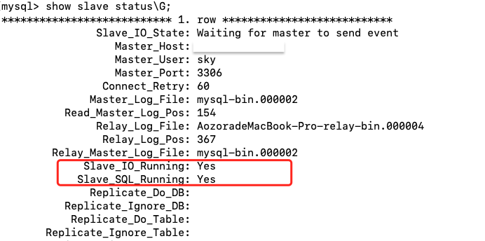 CHANGE MASTER TO MASTER_HOST='服务器IP', MASTER_USER='sky',