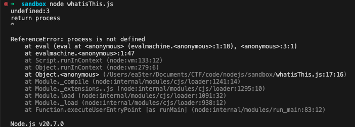 但是,在使用vm.createContext()创建的沙箱环境中(就是上面的第二种),默认是无法直接访问到global对象的。因此,沙箱逃逸的主要目标是找到方法将global或process对象引入到沙箱中,从而实现RCE。