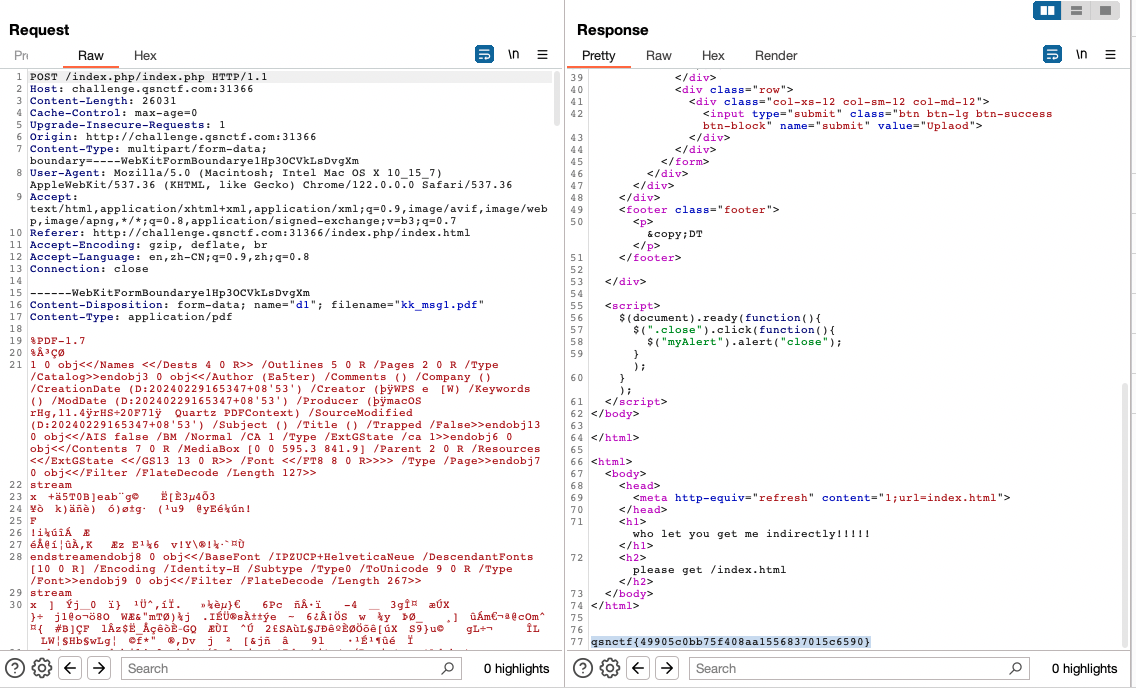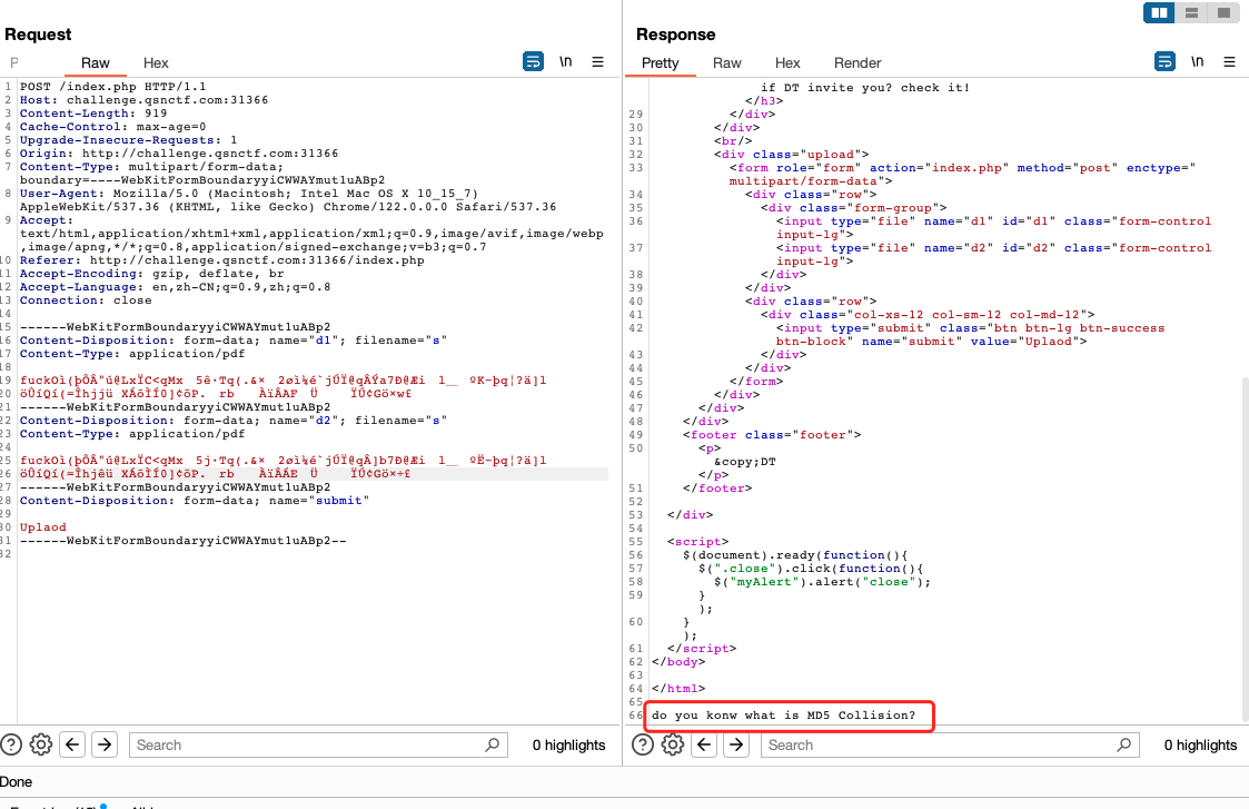 进去是一个PDF文件上传点,简单测试下发现提示MD5碰撞