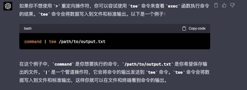因为PHP的exec执行命令并不会返回执行结果,但可以把执行结果输出到文件中。参考命令:command | tee /path/to/output.txt