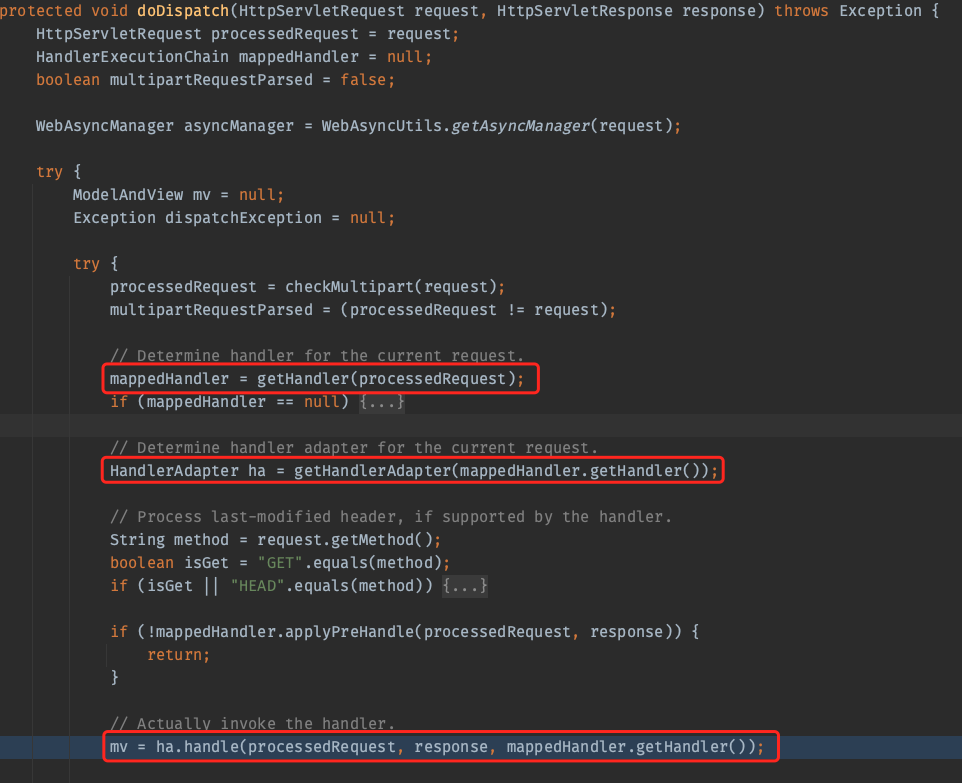 DispatcherServlet 分发请求到具体的Controller会先通过DispatcherServlet#getHandler找到处理该请求的mappedHandler(关于“什么”应该处理请求),然后根据mappedHandler得到对应的HandlerAdapter(关于“如何”处理请求)