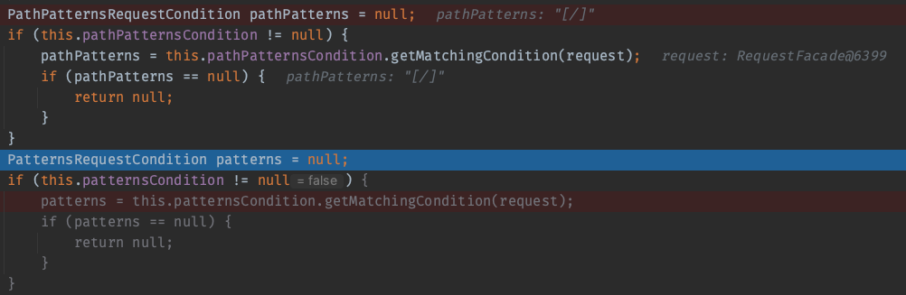 而通过对正常注册路径访问的调试,可以发现所有匹配都走的是PathPatternsRequestCondition匹配的。