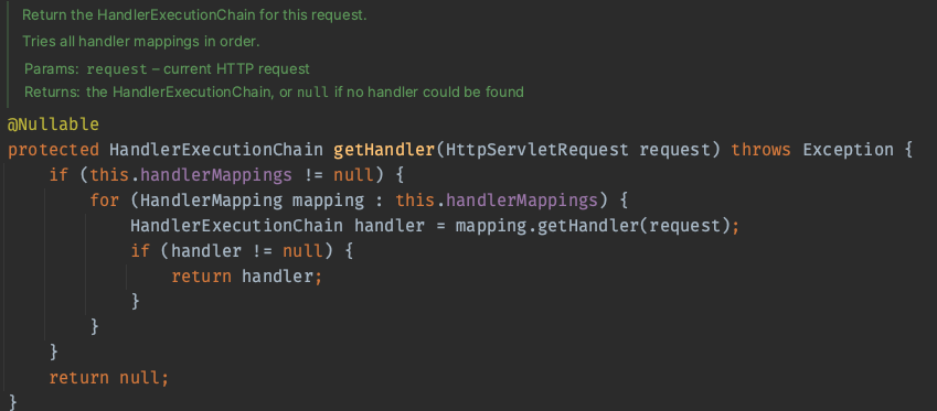 在 Spring MVC 中,HandlerMapping 是一个接口,负责根据 HTTP 请求查找对应的处理器(handler)以及任何相关的拦截器(interceptors),最终封装成一个 HandlerExecutionChain。在getHandler中,首先遍历的就是RequestMappingHandlerMapping