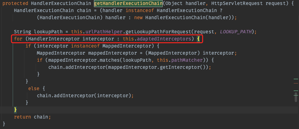 getHandlerExecutionChain中则会遍历 this.adaptedInterceptors 中的所有 HandlerInterceptor 类实例,加入到 HandlerExecutionChain 的 interceptorList 中
