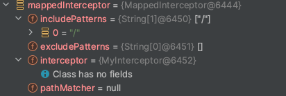 adaptedInterceptors 是一个列表,根据上面的代码,可以知道里面的元素是MappedInterceptor对象。在MappedInterceptor的中includePatterns是匹配的URL,interceptor则是拦截器对象。