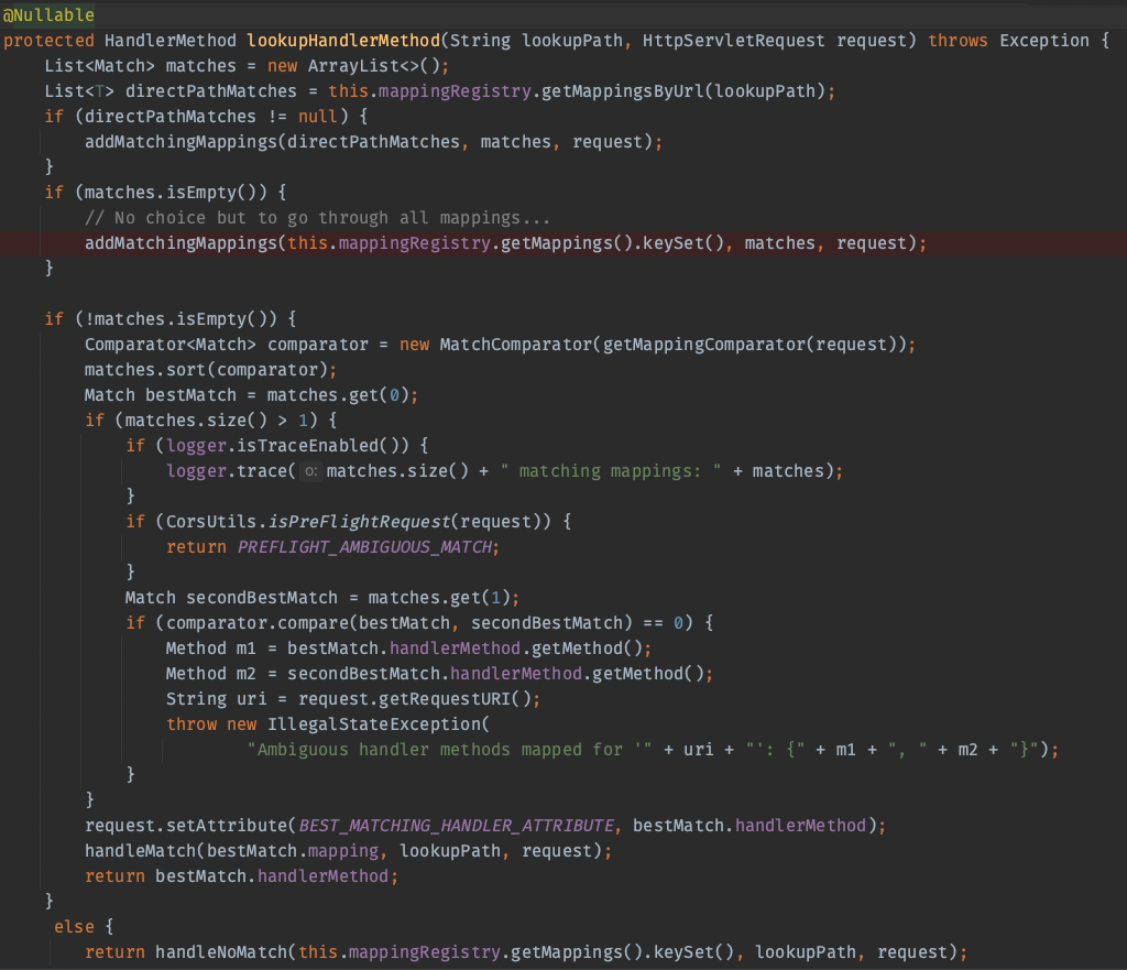 RequestMappingHandlerMapping最终会调用AbstractHandlerMethodMapping#lookupHandlerMethod来查找给定请求路径所对应的处理器方法。这里mappingRegistry维护了所有 URL 路径与处理器方法之间的映射关系,后面写入Controller用的就是它。