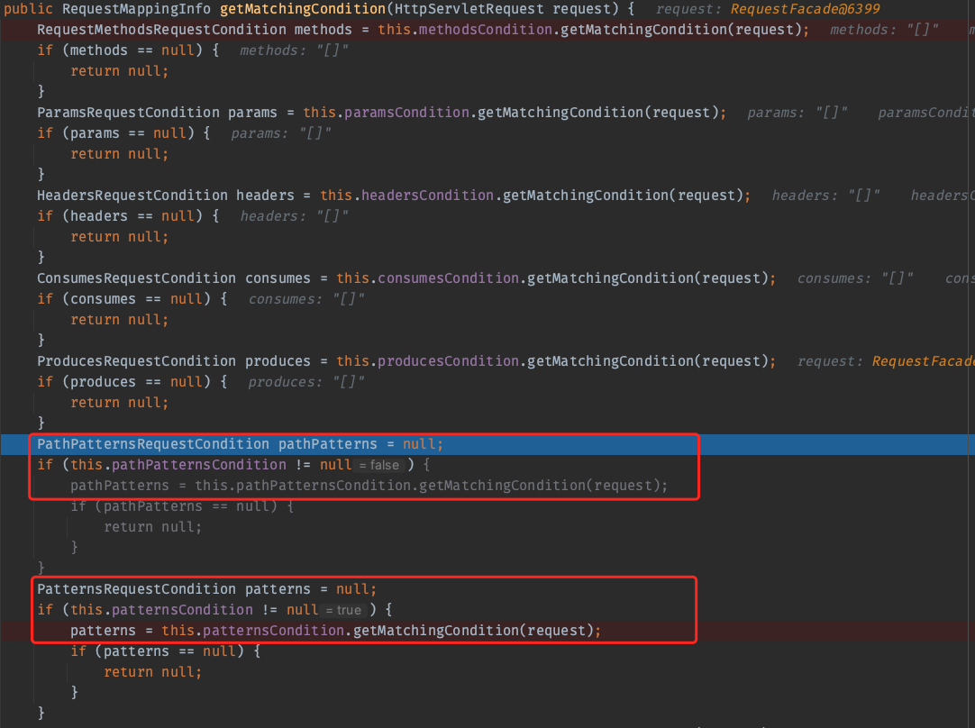 跟进lookupHandlerMethod,addMatchingMappings最后会调用到RequestMappingInfo#getMatchingCondition它是确定当前的 RequestMappingInfo 对象是否适用于指定的 HttpServletRequest 请求。它会按照请求方法、请求参数、请求头等条件进行筛选,而这个版本和前面有一个区别,就是增加了新的路径模式条件PathPatternsRequestCondition,这个在之前的代码中是没有设置的。