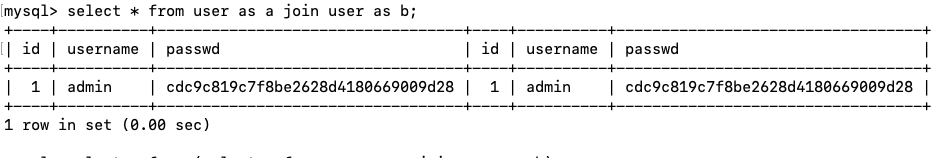 使用JOIN两个命名不同(a和b)的相同表(user)实例中选择所有列,结果是将一个表复制了两份拼接出一个新的表,使用别名的原因是JOIN不能连接两个相同的表名。