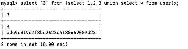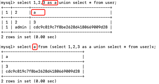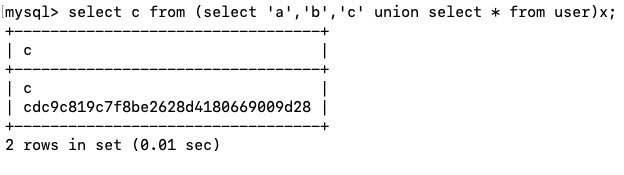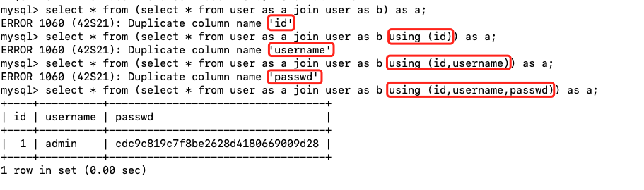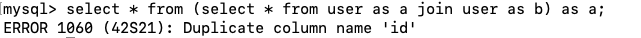 将两个user表的JOIN结果作为一个新的临时表a来进行查询,由于结果集中的列名不再是唯一的,这就导致了报错,进而我们就知道了这个表的字段。