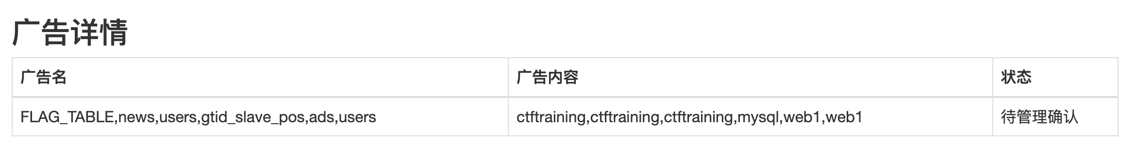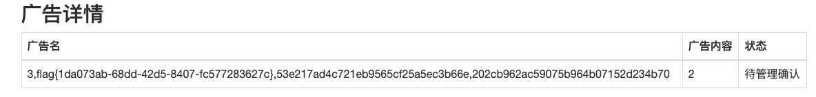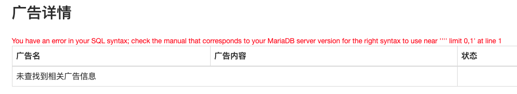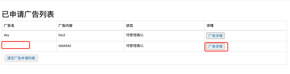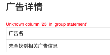 注入点就是这个广告详情,推测这里的查询语句是:select * from table where ad_name='name',这个name直接就取的是发布时候的广告名称。
