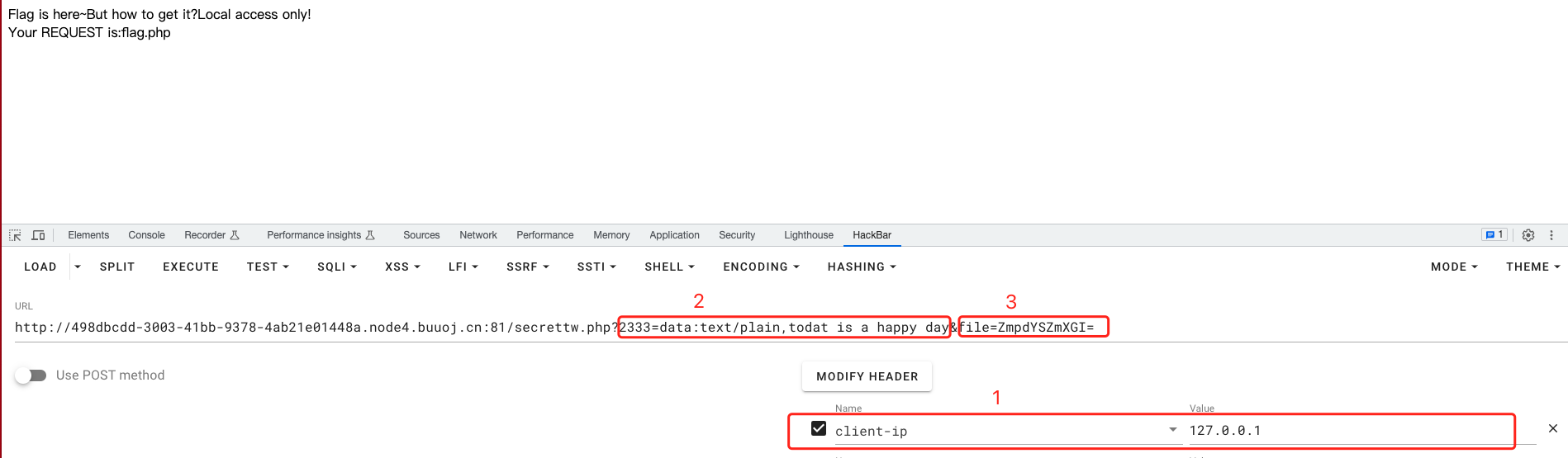 if($ip === '127.0.0.1' && file_get_contents($_GET['2333']) === 'todat is a happy day' ){